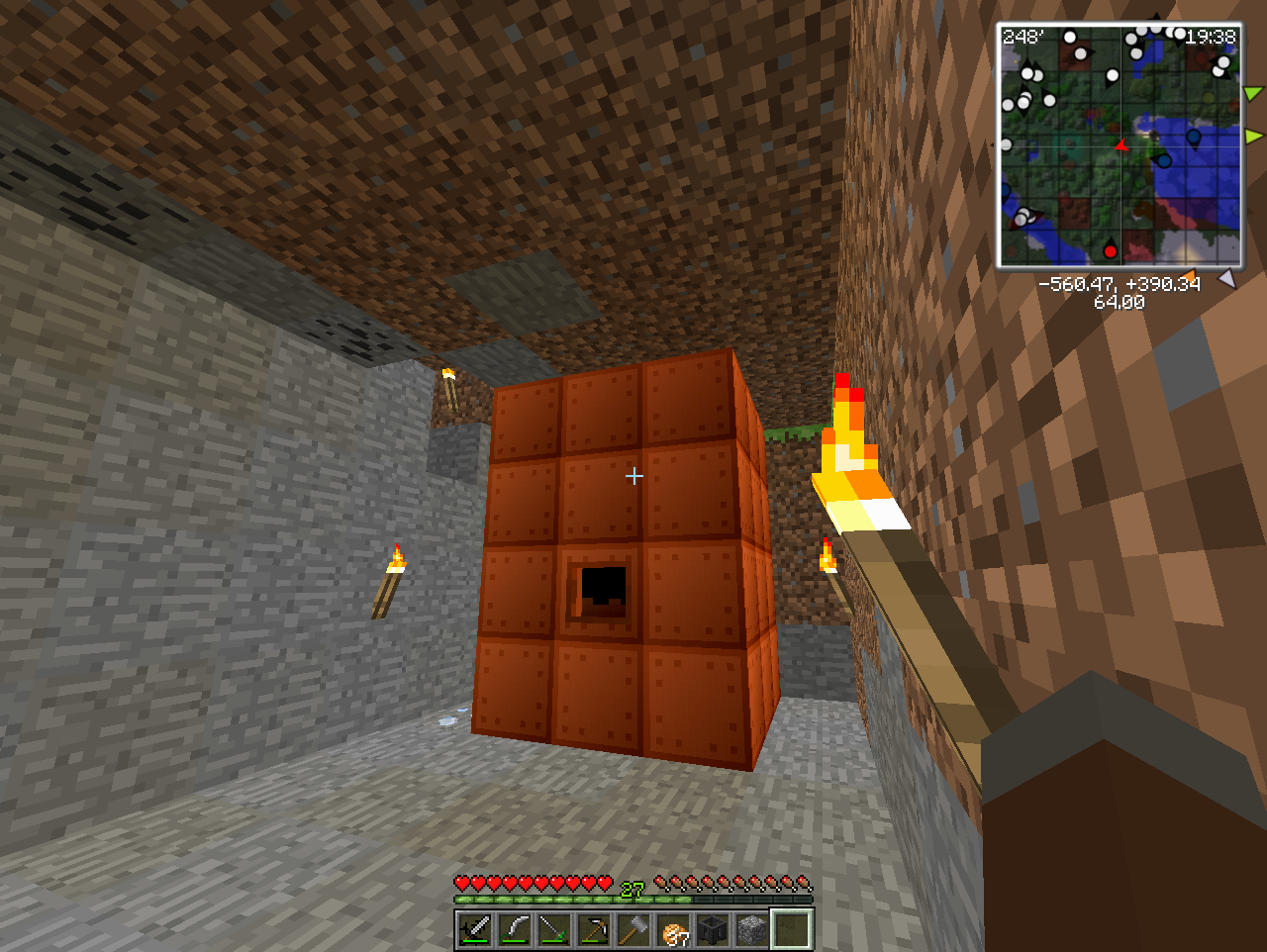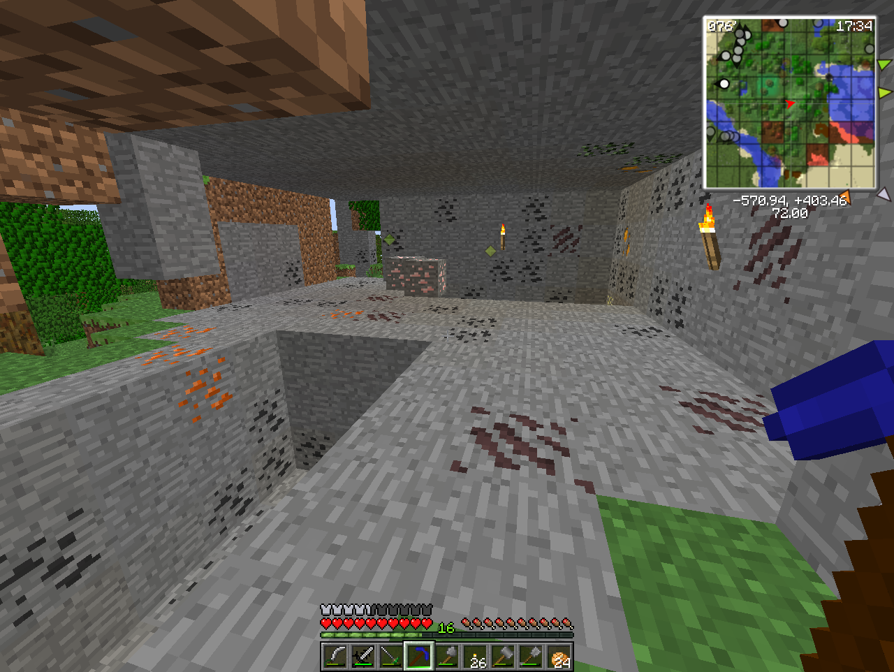 地下のブランチ用にはしごを作りたいが、松明やチェストの数も足りないのでハンマー階段掘りを決行する。
